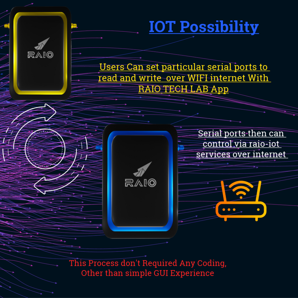 Control RAIO 1A over internet with RAIO TECH LAB application on any device. This thing could increase the distance further more. IOT controls wouldn't disturb you anymore with coding, the GUI control of App will make everything easy for you.