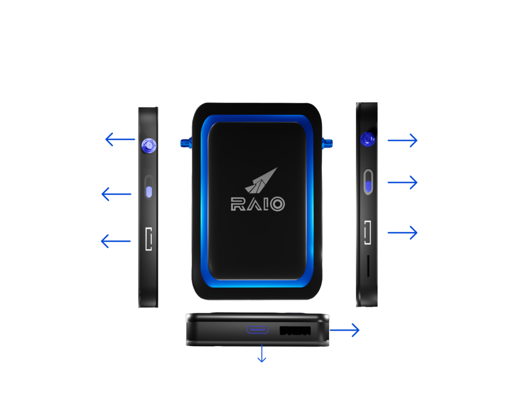 The Raio 1A is compact, powered by a 6000 mAh battery, and includes GPS, magnetic, and gyroscopic sensors for position tracking. Additionally, it offers an SD card slot for data logging across all six ports, ensuring that users can capture and store data for later analysis. Whether for personal use or complex projects, the Raio 1A is designed for versatility and reliability in wireless communication.